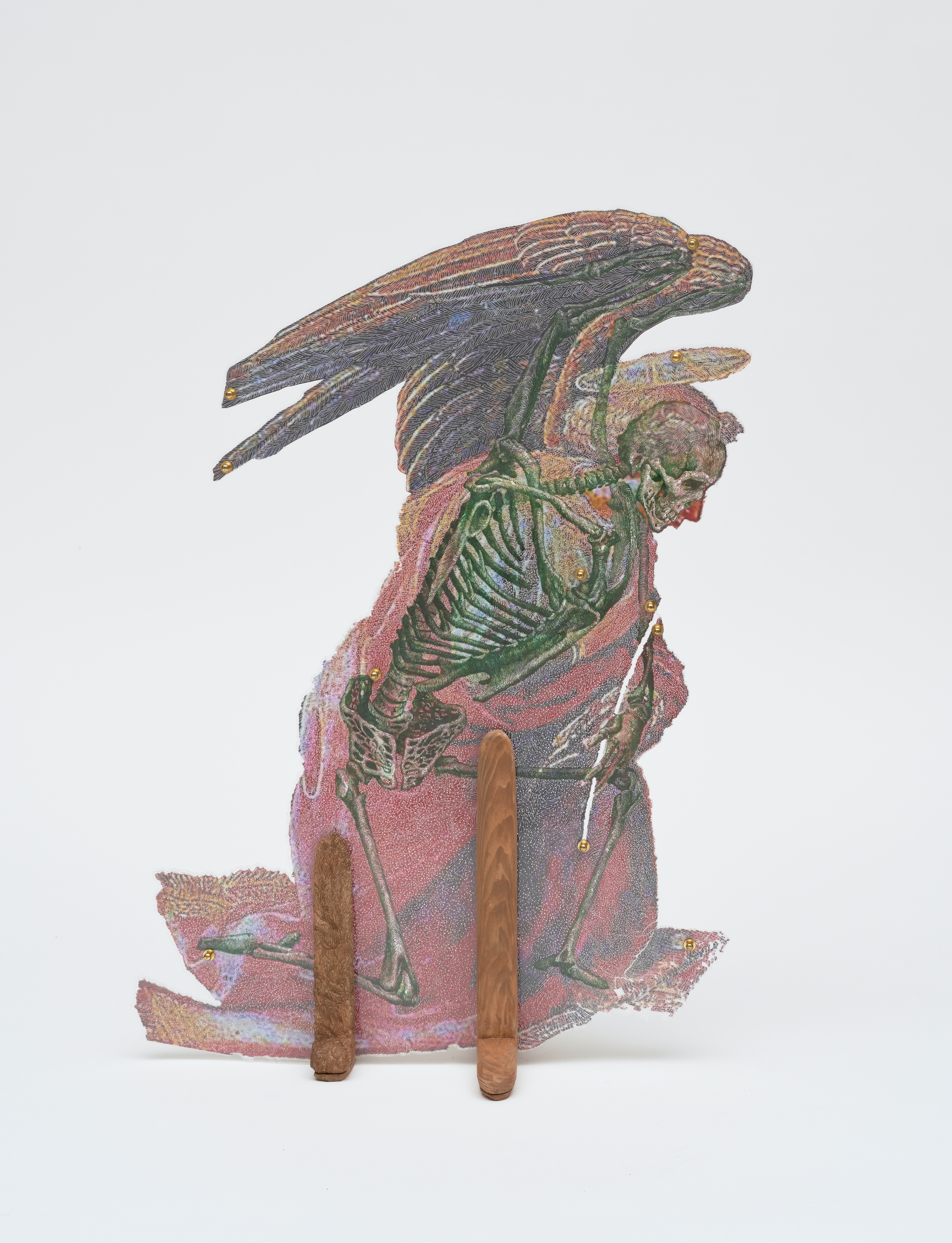 The skeleton structure of an angel embodied by scientific imagination is expressed based on a technique of scratching the surface of the output after printing an image of an angel appearing in Christian painting. The ideal imagination, which has covered the body's reality like colorful clothes and shining primrose, removes it by drilling a fine needle hole, and further creates a strange feeling as if looking at the fossils of living things that actually existed. And like wings that can only fly with feathers, the finished skeletal drawing is installed narrowly upright on the floor through a feather-carved acrylic plate and clips.