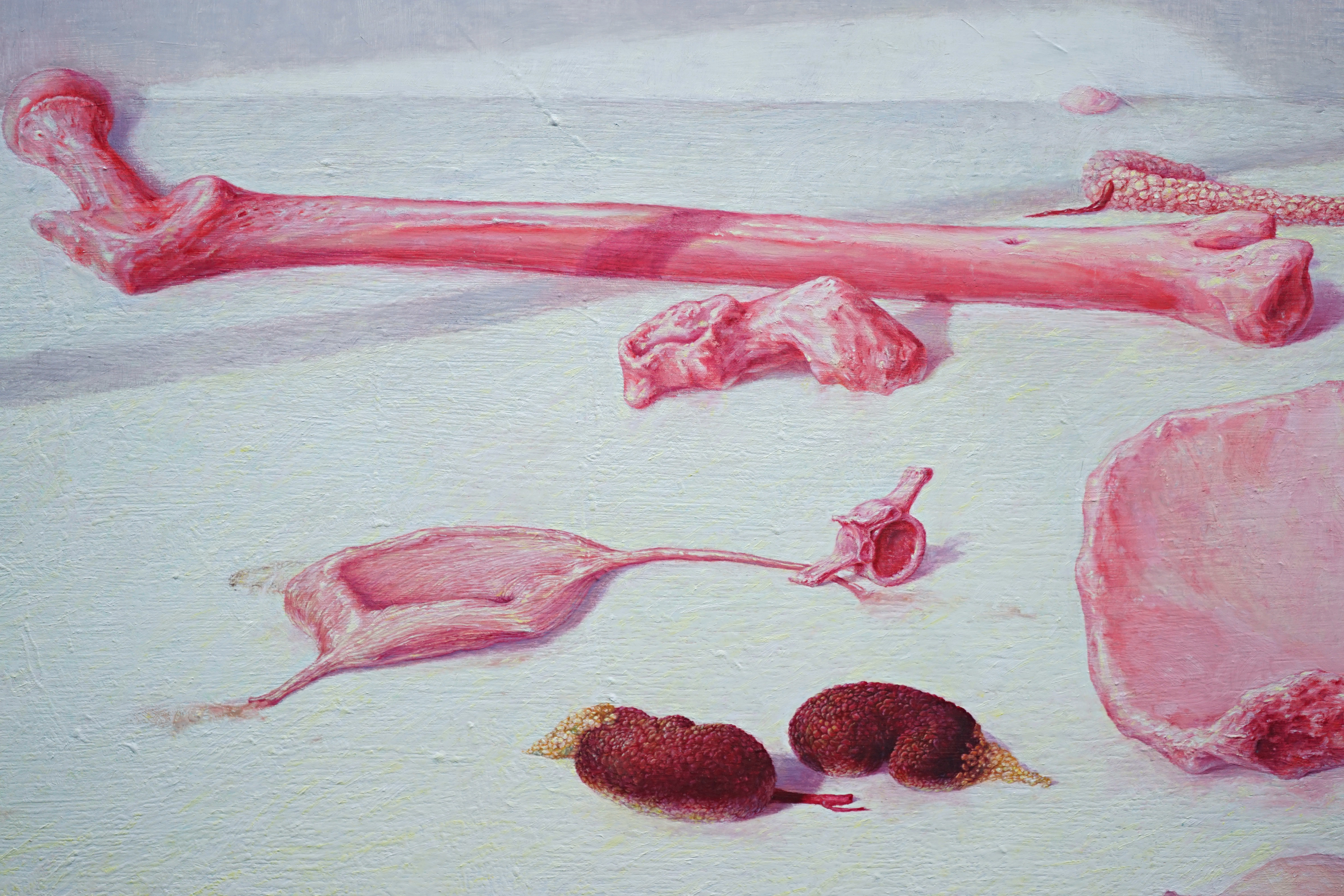 뼈와 장기 또한 몸의 주체와 일상을 함께하는 존재로서 삶에 많은 영향을 끼친다. 하지만 뼈와 장기는 태아처럼 출산이라는 분리 과정이 약속되어 있지 않다. 작가는 이러한 상황을 두고 자신의 몸속에 있는 뼈와 장기들을 자신이 임신 중인 - 그러나 출산 계획이 없는 아기들로 감각하며, 자신의 뼈와 장기를 자신의 두눈으로 직접 마주하는 풍경을 상상하기로 한다. 참고 자료없이 상상으로만 구현된 뼈와 장기는 사실적인 정물화 속의 개체들로 등장하지만 작가의 시각적 사고가 가진 한계가 제거되지 못한채 다듬어진 모습으로 표현된다.