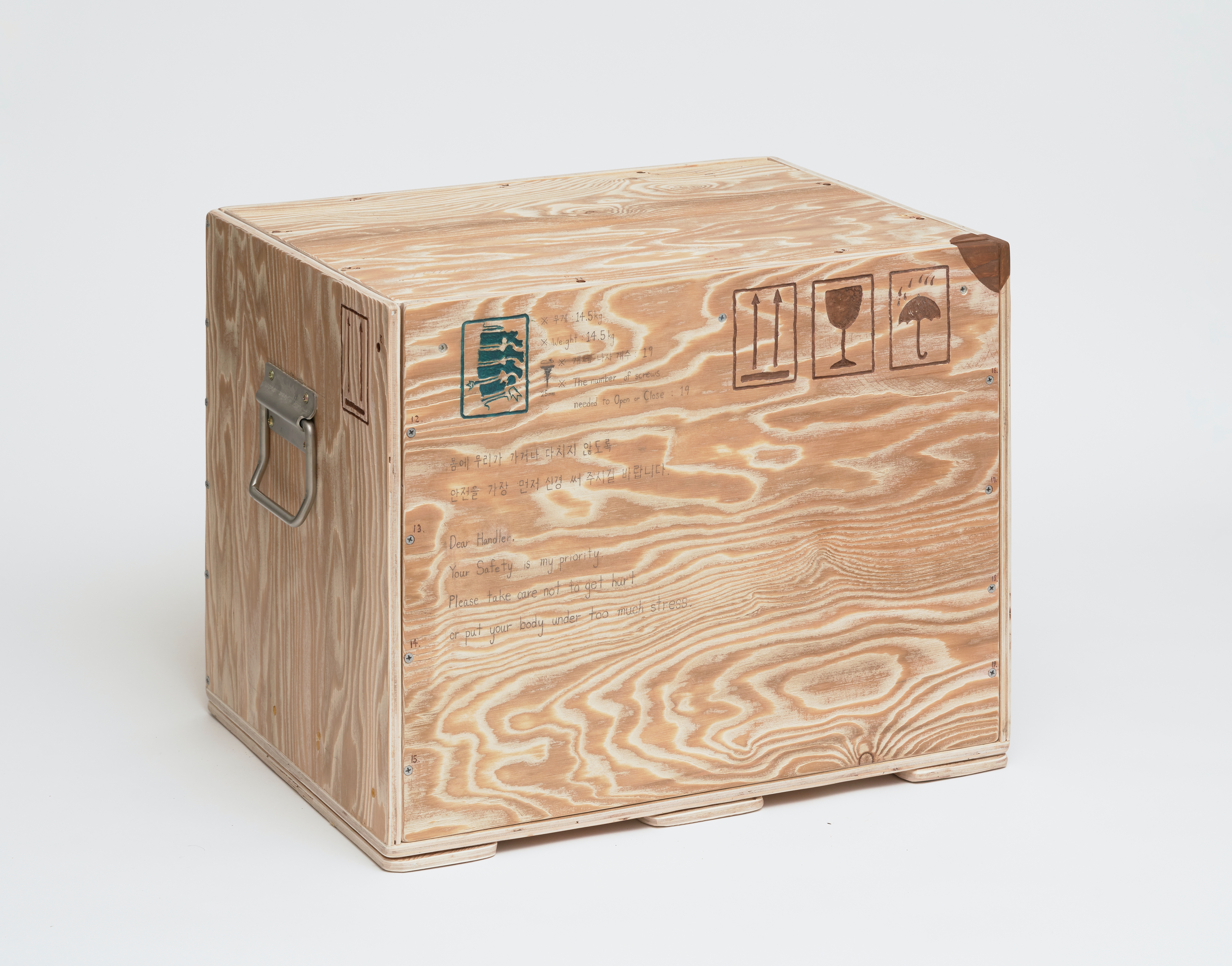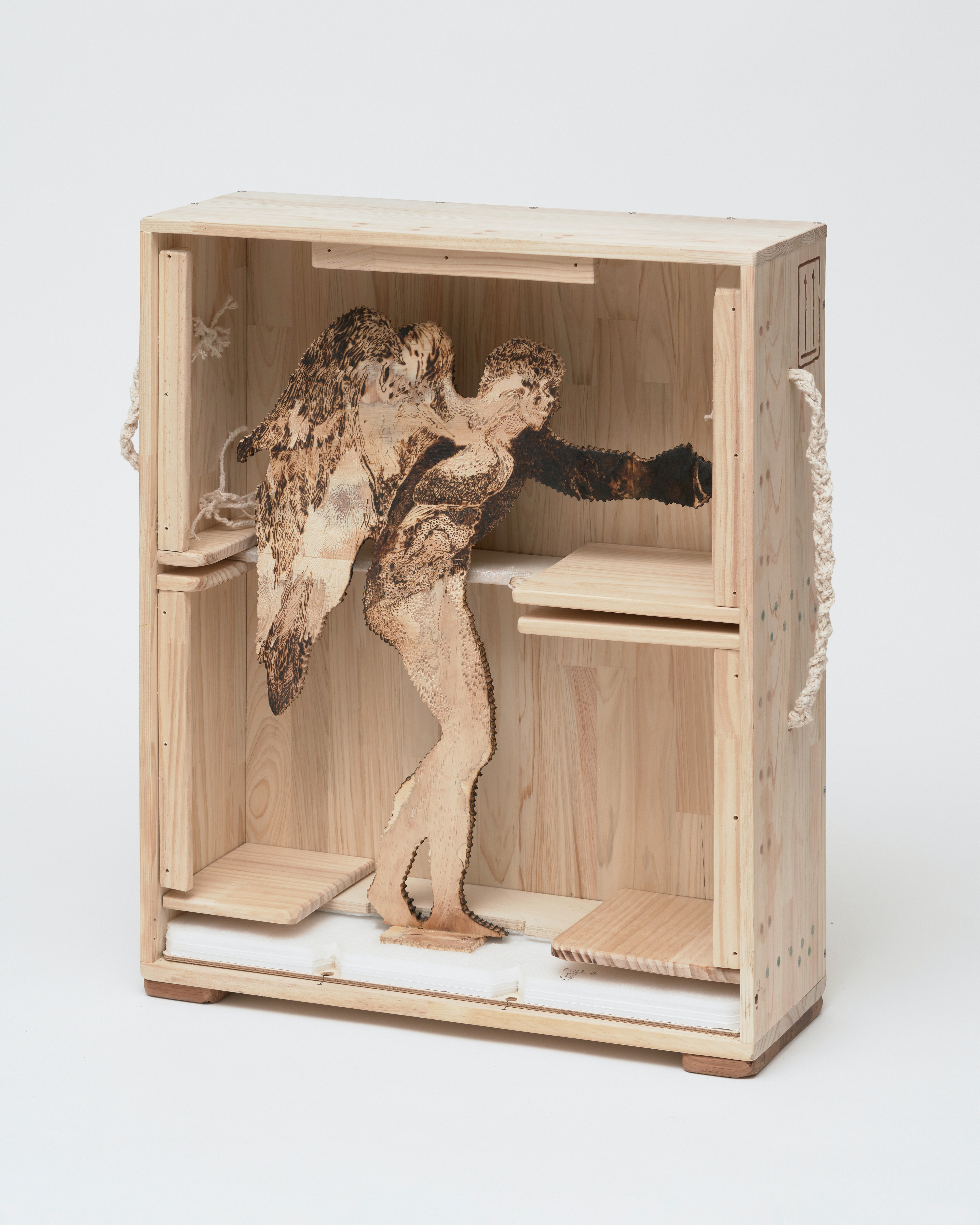plywood, glued wood panel, PE foam, foam board, iron handle, screws, bees wax, oil stain, handwriting with pencil