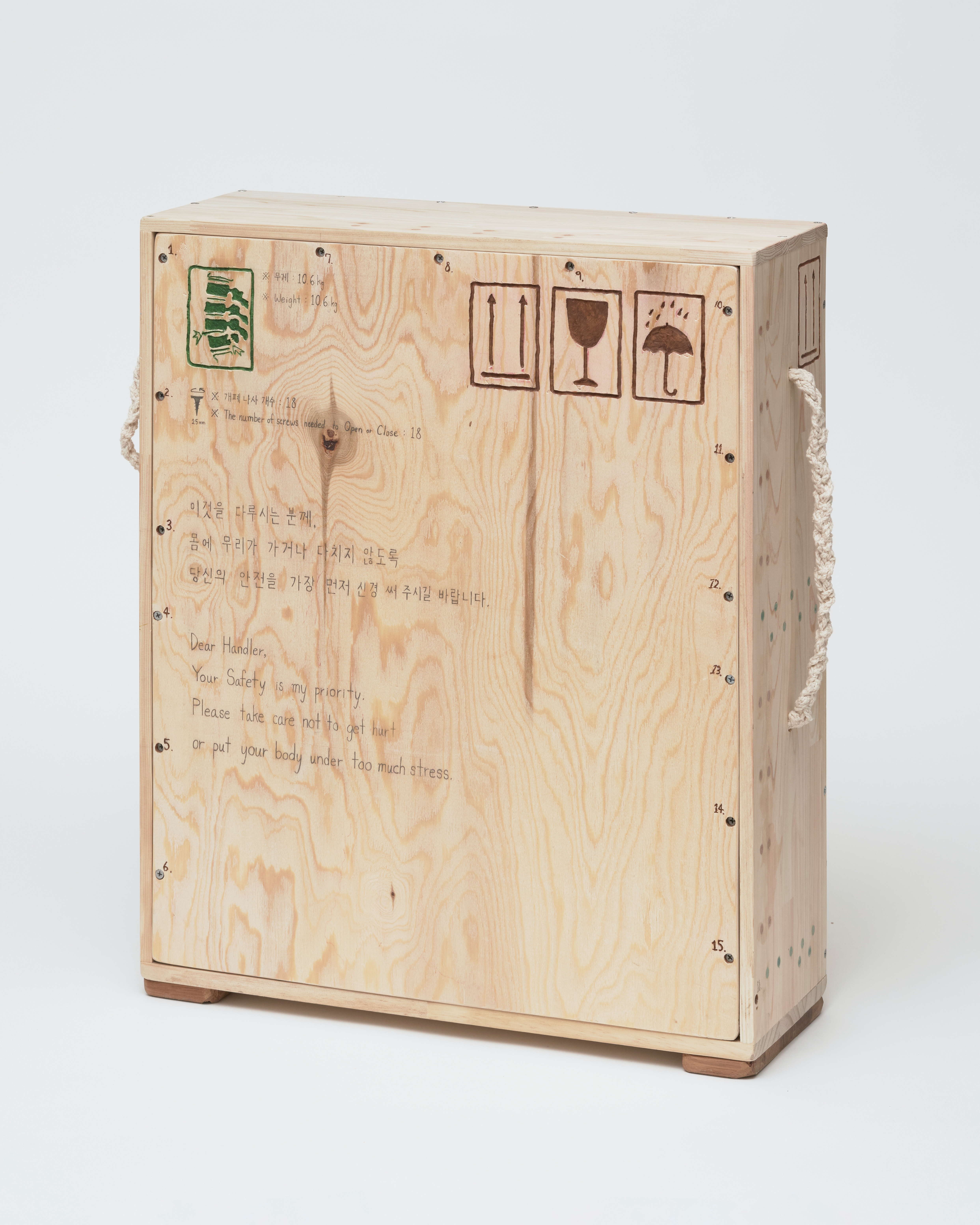 plywood, glued wood panel, PE foam, foam board, braided cotton string handle, screws, bees wax, oil stain, handwriting with pencil
