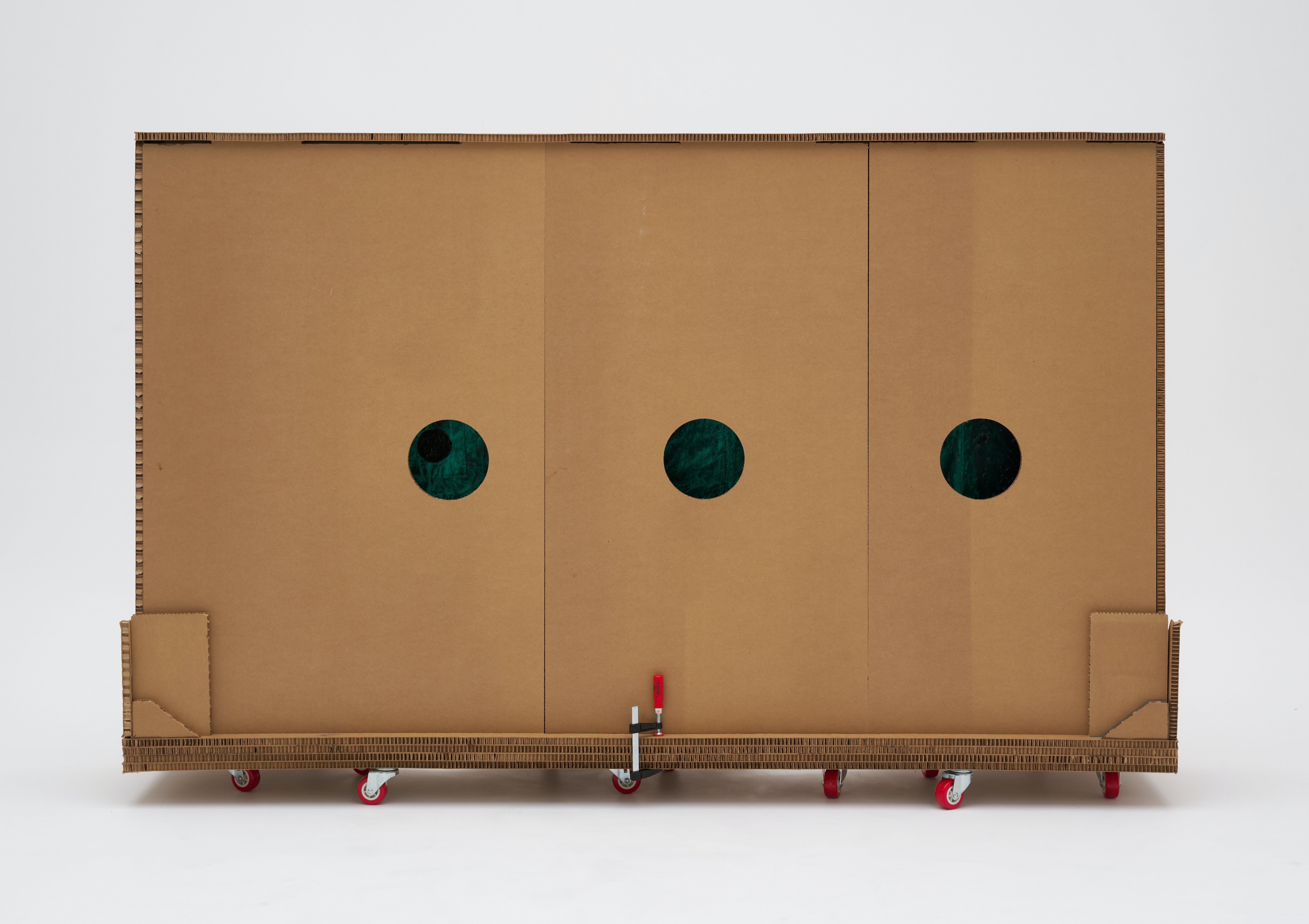The artist considers the work <Sheep Box 3> itself as a sheep with an unstable body and creates a customised box for it as a sheep box protecting a sheep inside. The crate made of lightweight and rigid honeycomb board, prevents external impacts and the wheels under the crate’s body help to move the heavy work smoothly. The crate is designed to keep the artwork as close as possible to the delicate colour screen at the front, while preventing it from wobbling in the box.