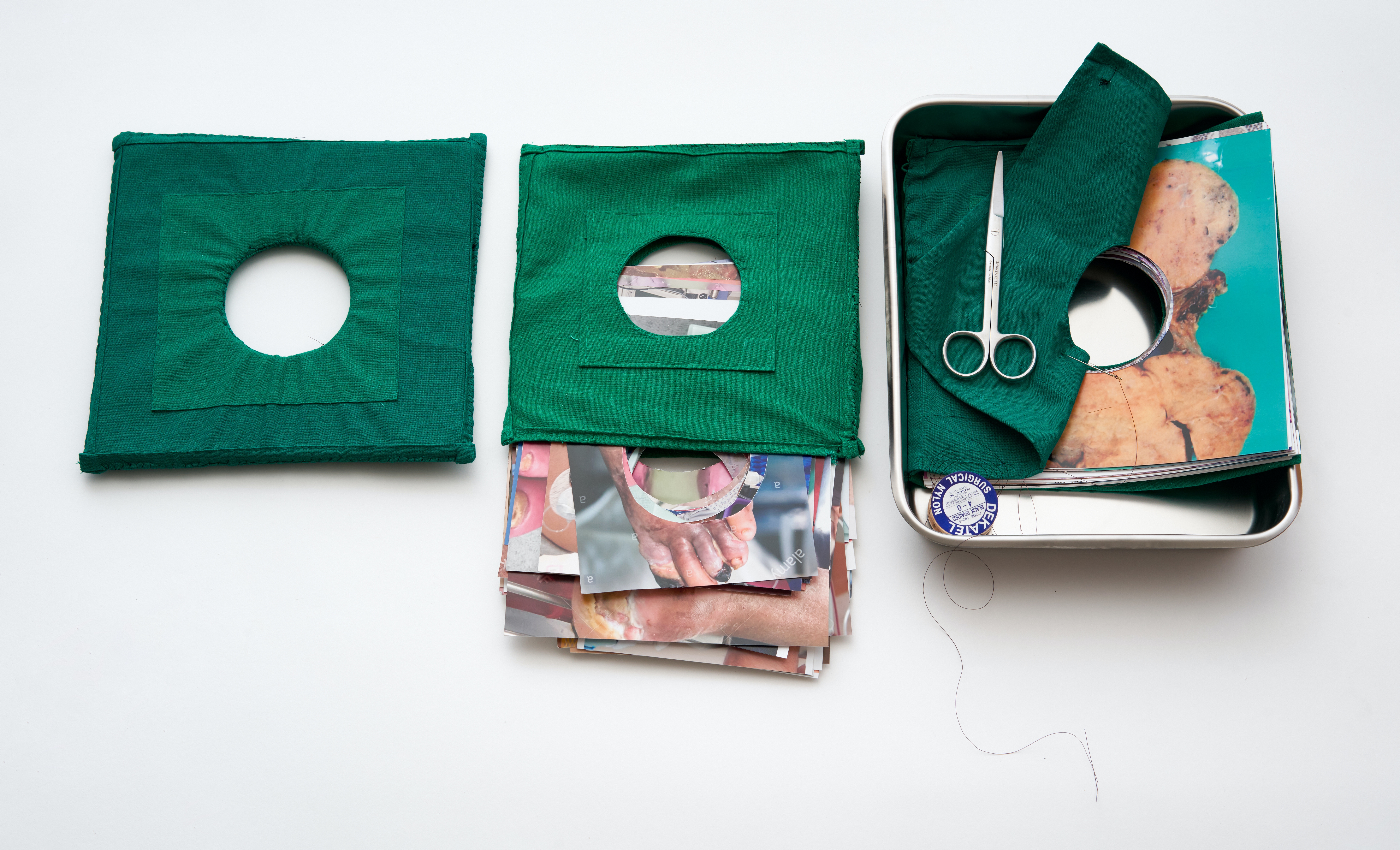 수술포는 구멍을 통해 몸 안의 병을 직시할 수 있는 도구임과 동시에 수술포 구멍 주위의 천으로 몸을 가릴 수도 있는 이중적인 도구이다. 이를 이용해서 작가는 두 겹의 수술포를 겹쳐 바느질한 뒤 검색된 질병의 이미지를 봉인시킨 오브제를 제작한다. 바느질 제거 여부를 선택함으로써 내부의 이미지를 향한 외면과 직시를 주체적으로 선택할 수 있는 오브제는 시각적 트라우마를 대항하기 위한 도구가 된다.