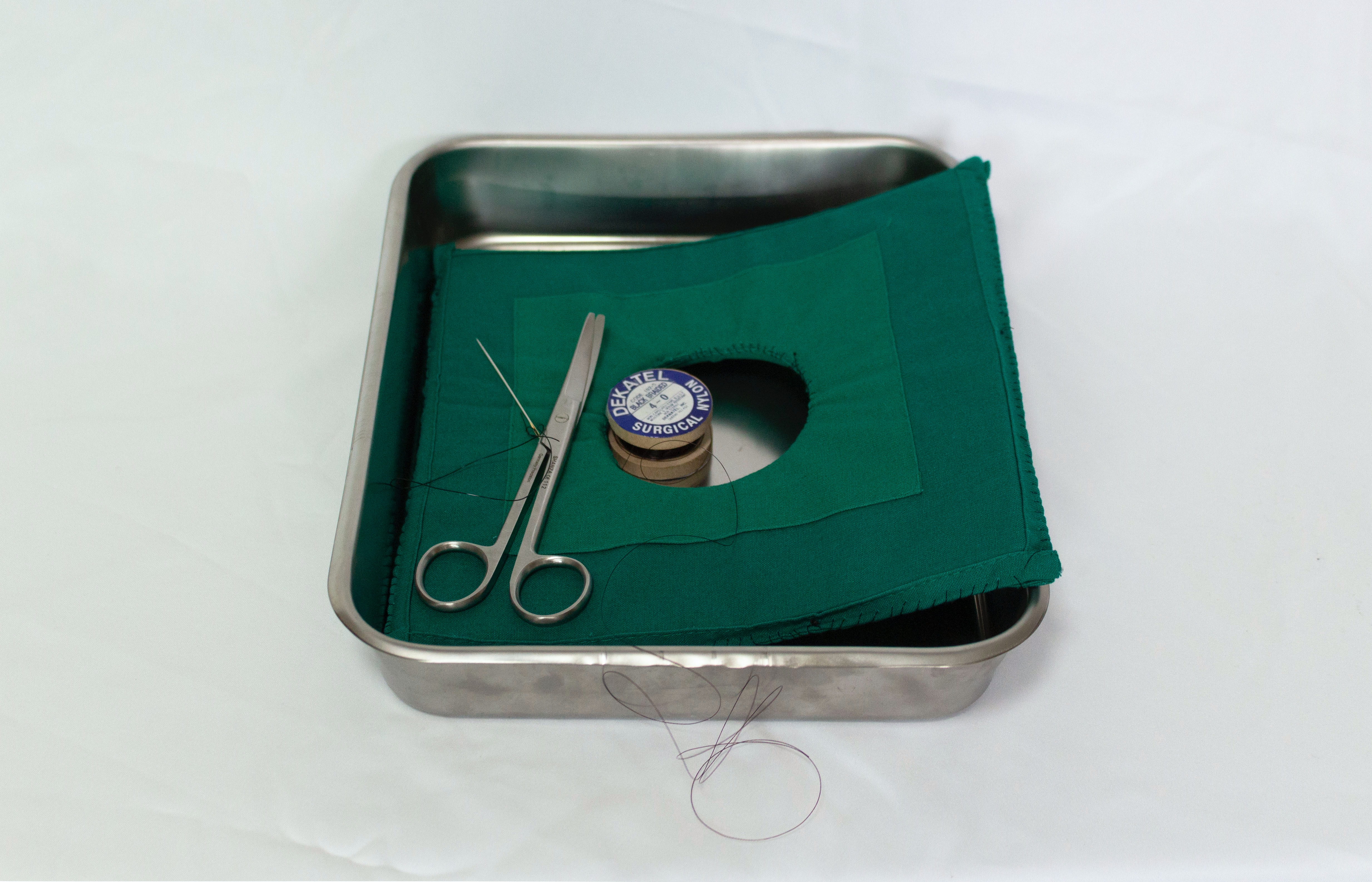 Surgical drape is a tool that can face the disease in the body through the hole, and at the same time, it is a dual tool that can cover the body with a cloth around the hole. Using this, the artist creates an object that seals the image of the searched disease after sewing two layers of surgical cloth together. By selecting whether to remove sewing, objects that can independently select the outer surface and direct view toward the internal image become tools to counter visual trauma.